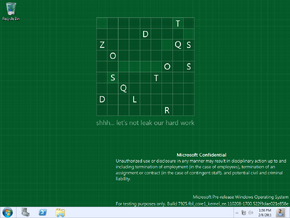 - The desktop wallpaper has been changed to a plain dark green background featuring a wordoku puzzle with the leak warning. This wordoku would eventually be solved to form "Start Me Up", seen firstly since the build 7908 of its client counterpart.